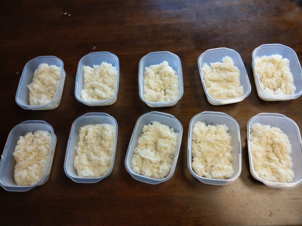 - 鶏肉の中心までしっかり火が通るようにしましょう。その間に、タッパーにご飯を10食分詰めておくと効率的です。